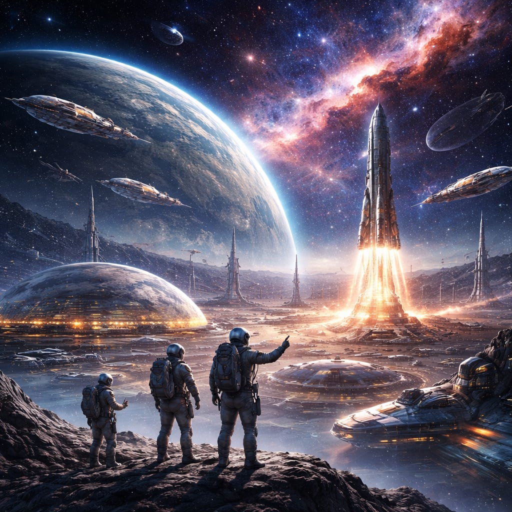 Earther-Led Galactic Expansion. Descendants of Earth actively open new habitable planets and occupy them, creating thousands of new worlds. They develop hyperspace drives, master starship construction, and build orbital infrastructure to allow large-scale expansion. Expansion is coordinated from Earth, eventually leading to the formation of the Galactic Empire.